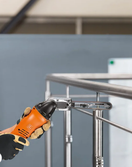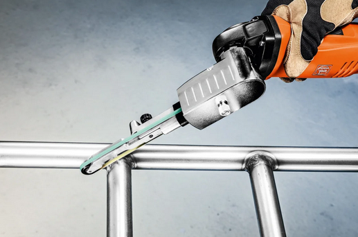 - Start-Set mit gekröpften und geraden Schleifarmen für unterschiedliche Anwendungen, keramische Schleifbänder für effektive Schweißnahtbearbeitung und Vliesbänder für Finishing-Arbeiten in verschiedenen Breiten.