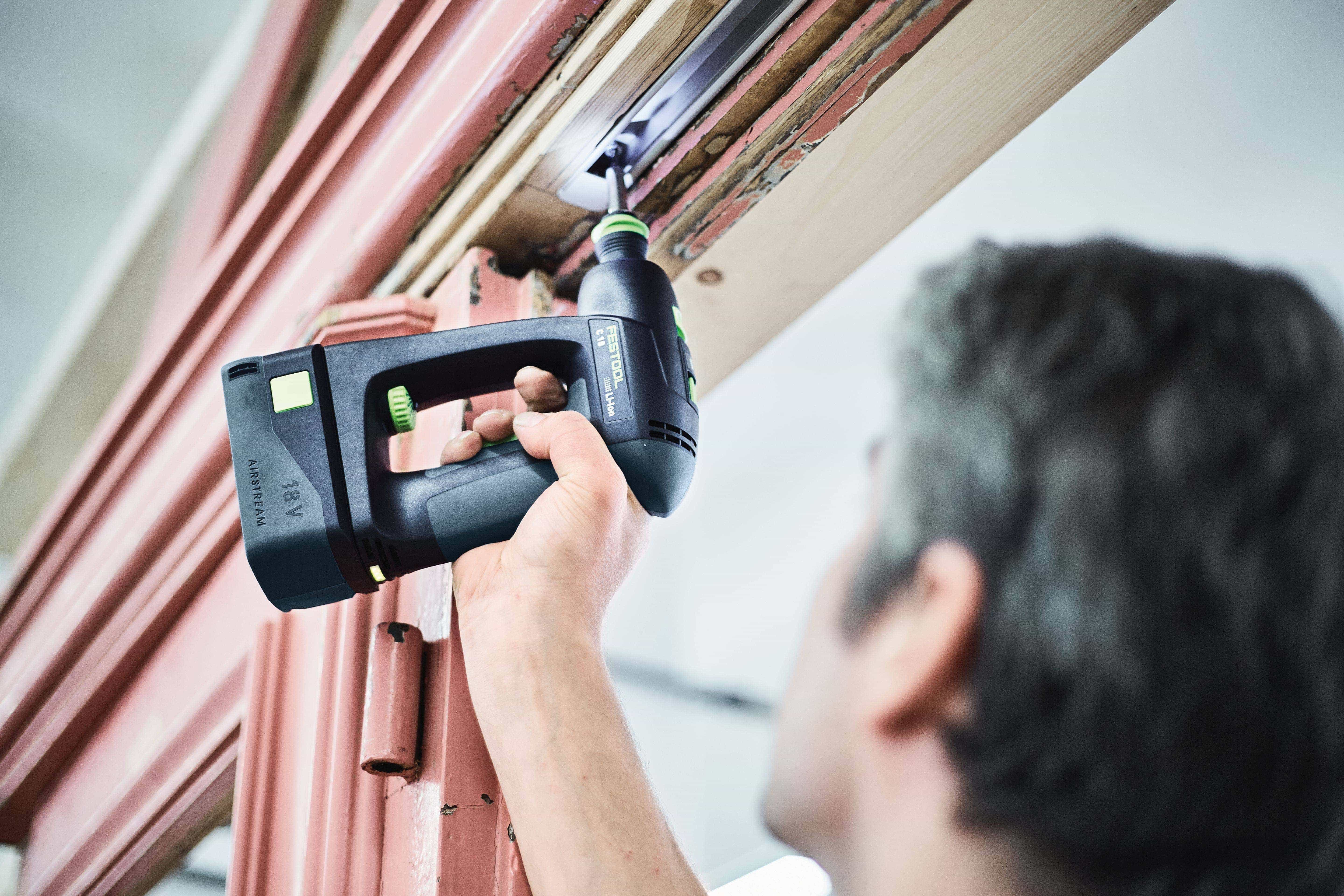 Für volle Flexibilität beim Bohren und Schrauben: vollelektronische Drehmomenteinstellung, CENTROTEC Schnellwechselsystem, Winkel- und Exzentervorsatz sowie Tiefenanschlag lösen jede Bohr- und Schraubanwendung. Die Kombination aus Li-HighPower Akkupack und bürstenlosem und somit wartungsfreiem EC-TEC Motor machen den Akku-Bohrschrauber C 18 leicht, langlebig und ausdauernd. Für einen sorglosen Alltag sind Akkuschrauber und Akkupack mit dem Festool Service rundum abgesichert. Erhältlich in der einzigartigen C-Bauform oder – je nach individueller Vorliebe – in T-Bauform auch als T 18+3.