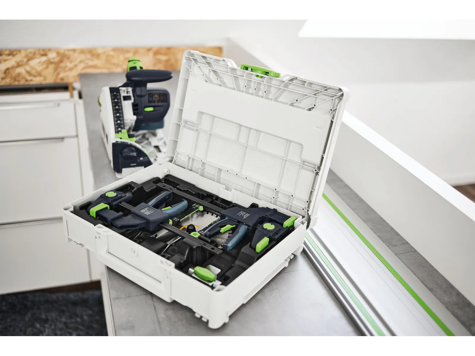 Dieses Set ist die perfekte Ergänzung für deine Tauchsäge: Mit dem Eintauch-Positionsanzeiger triffst du zuverlässig bei jeder Schnitttiefe den genauen Ein- und Austrittspunkt deines Sägeblatts. Einfach von oben auf die Nut der Führungsschiene einsetzen und fixieren. Dann die Skala des Markierungsanzeigers auf die Tiefeneinstellung deiner Tauchsäge einstellen, am Anriss ausrichten und Ausschnitte präzise dort setzen, wo du sie brauchst. Mit den passenden Einhandzwingen fixierst du deine Führungsschiene mit nur einem Handgriff am Werkstück, für sichereres und kontrolliertes arbeiten. Zusätzlich gibt es im Systainer auch noch Platz für deine Sägeblätter und die FS-Verbinder – so hast du dein Systemzubehör immer griffbereit.