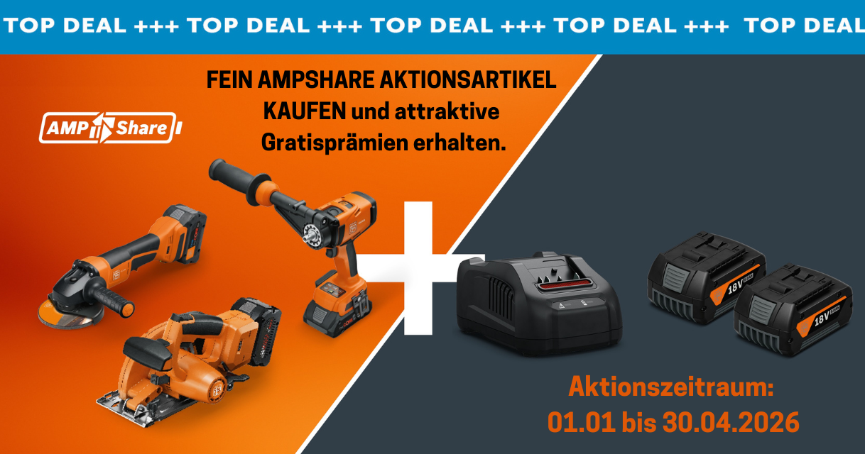 Die AMPShare Schnittstelle ermöglicht fast 50 % mehr Verschraubungen (ca. 1 300 Verschraubungen Ø 5 x 40 mm in Holz) pro Akku-Ladung bei bestehender FEIN Qualität. (ProCORE 4 Ah).